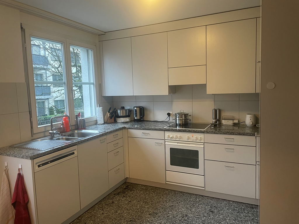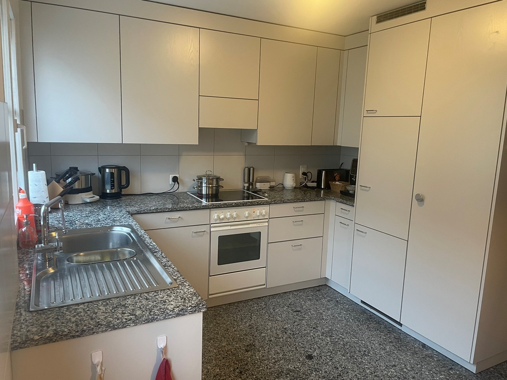 Die Küche verfügt über einen Glaskeramikherd, Geschirrspüler und einen grosszügigen Kühlschrank. In allen Zimmern ist Parkett verlegt.