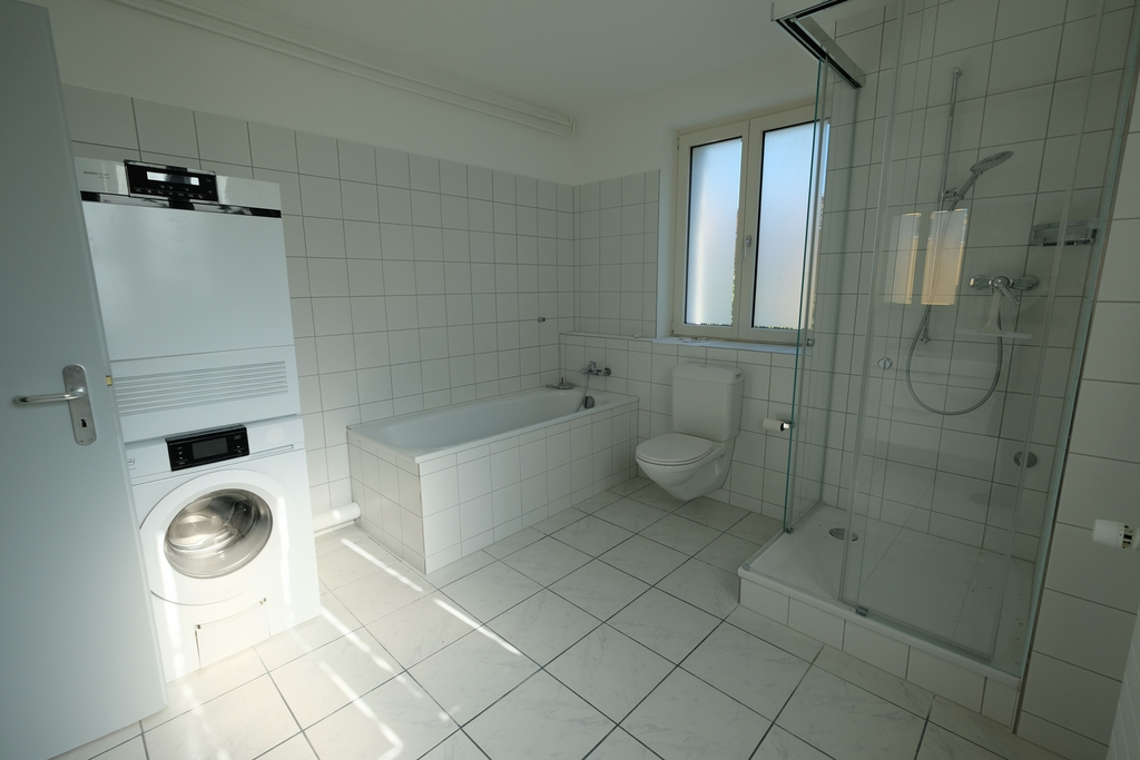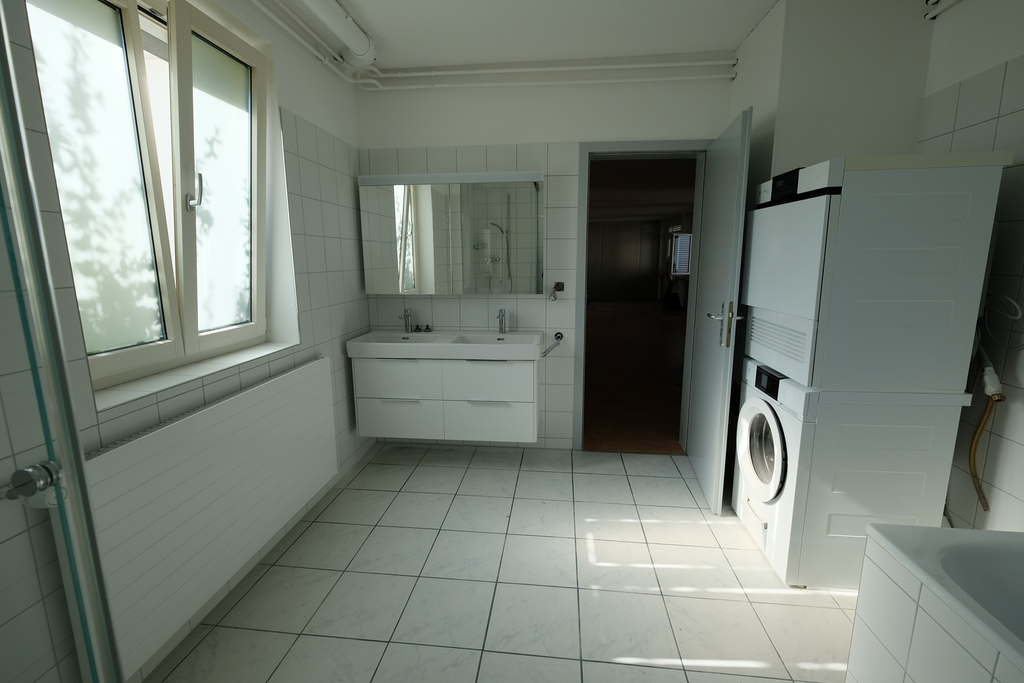Im Badezimmer sind sowohl Badewanne wie auch Dusche vorhanden. Eigene Waschmaschine und Tumbler stehen Ihnen in der Wohnung zur alleinigen Nutzung zur Verfügung.