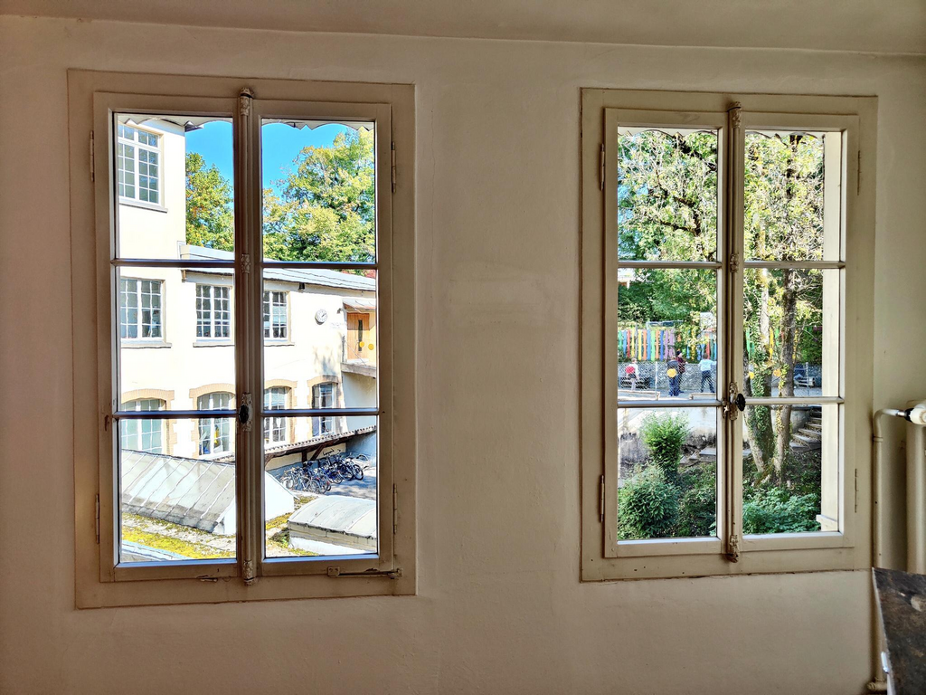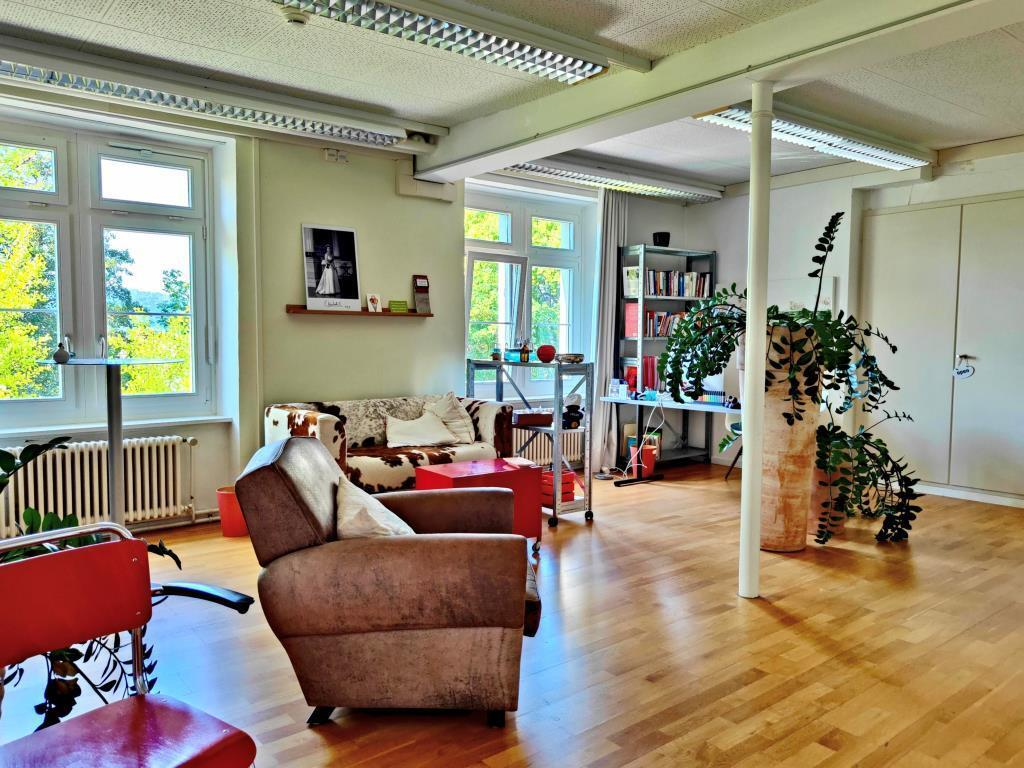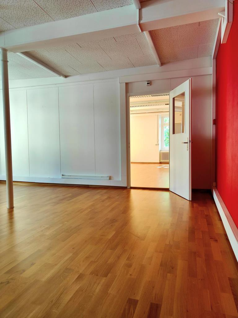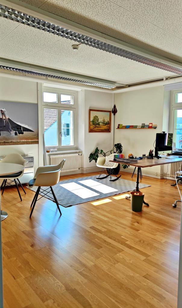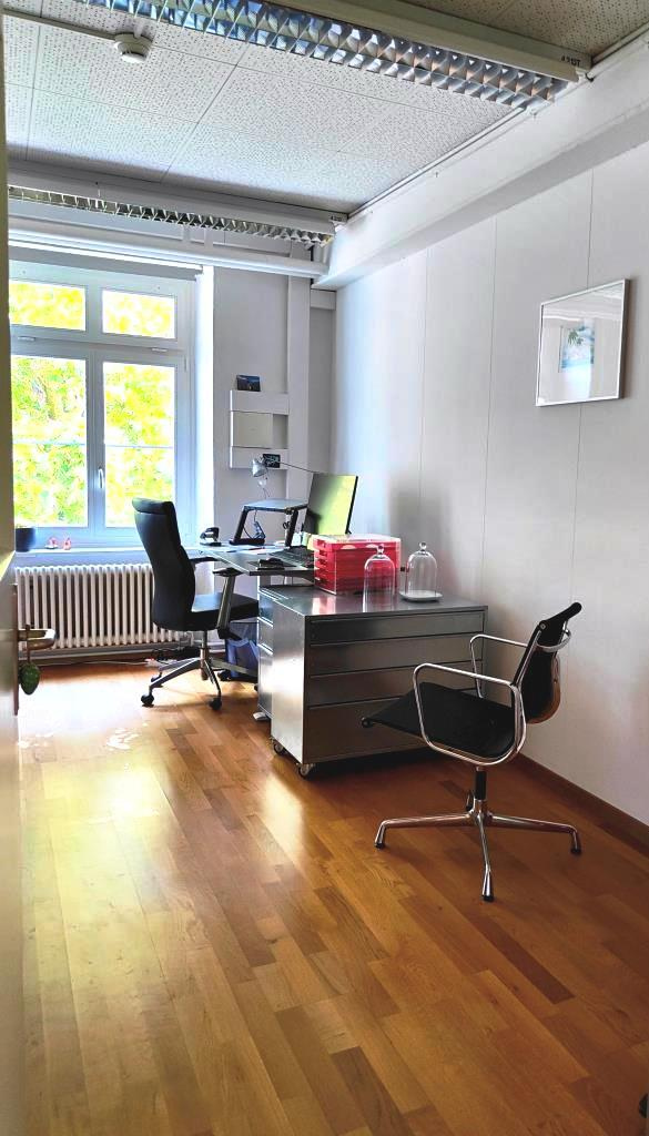 Zu vermieten ist dieses besondere Büroräumlichkeit mit mehreren Einheiten, hufeisenförmig, im denkmalgeschützten Gewerbehaus Turicum in Niederuster.