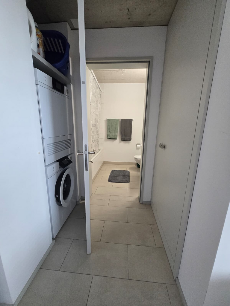 Die grosszügige Wohnküche ist modern ausgestattet und verfügt über V-ZUG Einbaugeräte. Im Korridor vor dem Bad befindet sich der eigene Waschturm.